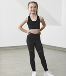 Racer back style. Self fabric bound neckline armholes and racer back. Self fabric mesh used for front straps V insert and back panel. Removable padded cups (age 11-13 only). Ribbed hem.