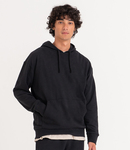 70% recycled cotton/30% recycled polyester. Soft peached fabric with brushed inner. Relaxed fit. Drop shoulder style. Hood with drawcord. Front pouch pocket. 2x1 ribbed cuffs and hem. Unbranded size label. Recycled cotton is made from 100% pre-consumer waste.