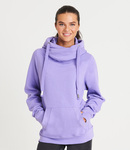 Soft cotton faced fabric. Brushed back fleece. Drop shoulder style. Three panel double fabric hood with flat lace drawcord. Crossover neck detail. Front pouch pocket.